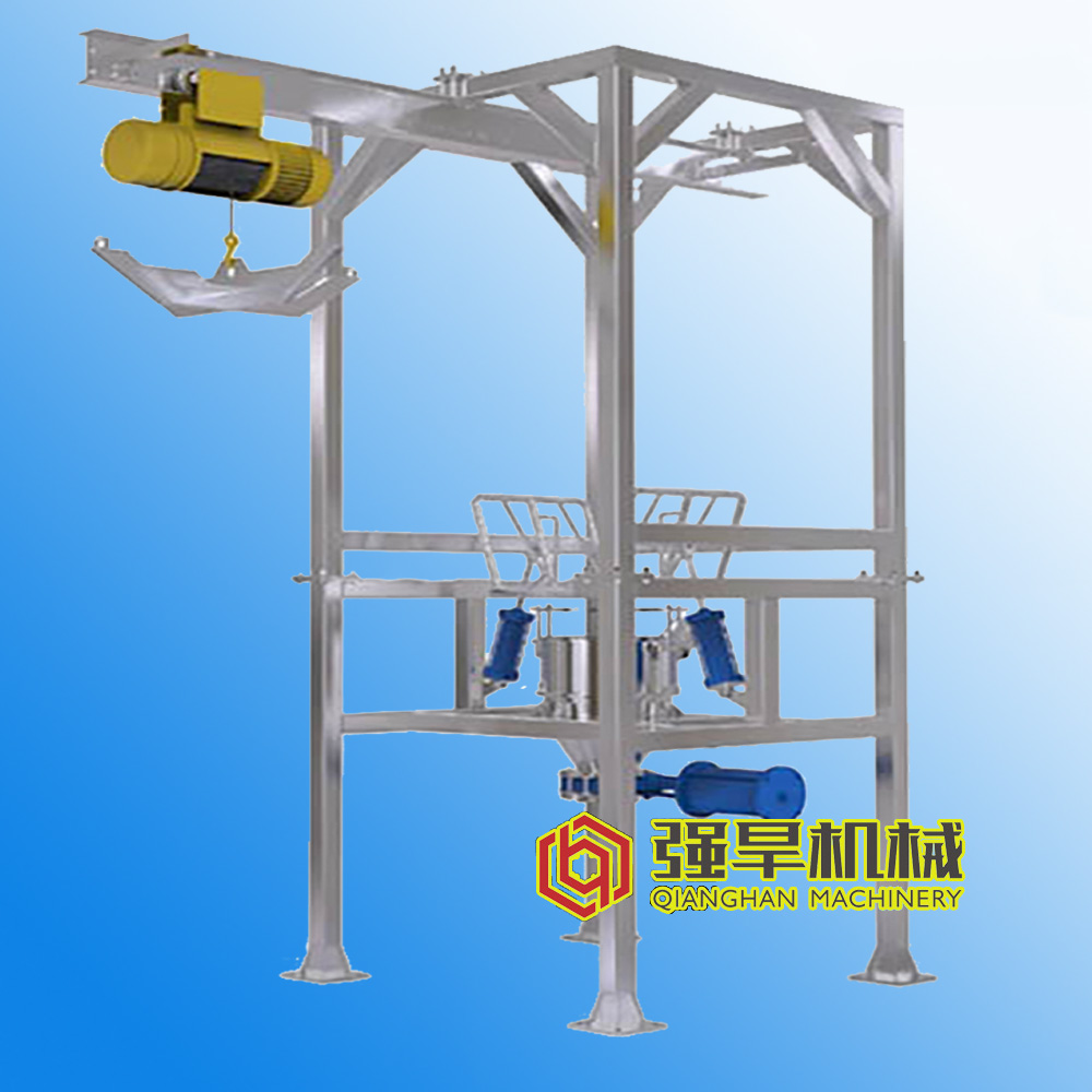 首先準(zhǔn)備卸料工作。人工操作按鈕,移動(dòng)電動(dòng)葫蘆或者使用客戶自己的行車等吊裝工具,將吊架移至噸袋上方。把包裝袋的袋繩掛在噸袋吊架上,鎖好后確保袋繩不會(huì)滑落。